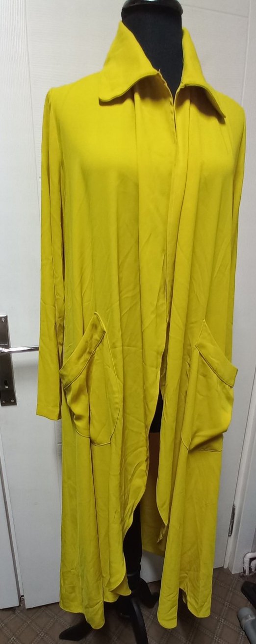 Kadınlar için uzun, sarı renkli, salaş kesim kap. uzun kollu, büyük ön cepler içerir. 2 beden 36_38_40 uyumludur