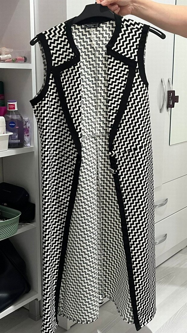 Kadınlar için uzun, kolsuz, siyah-beyaz desenli yelek. Modern kesimi ve kesik yakasıyla günlük kullanım için uygundur. Sentetik kumaştan, rahat kesim.
