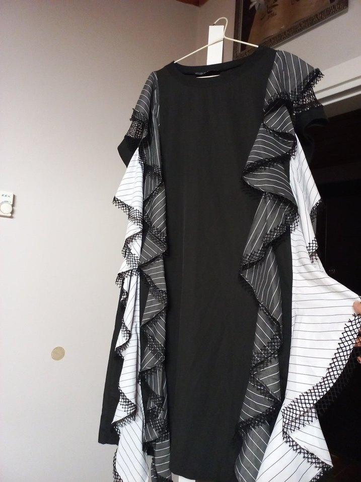 Uzun siyah elbise, desenli sentetik kumaş, fırfırlı yanlar, bol kesim ve kısa kollu, avangard tarzı yansıtıyor.