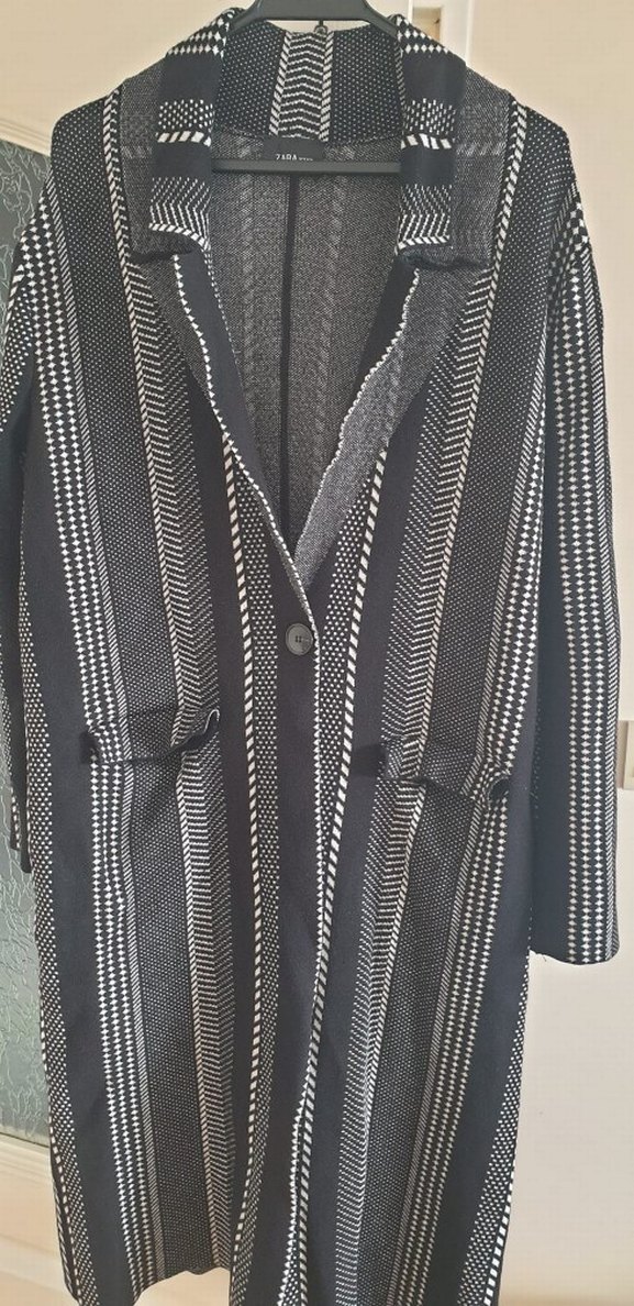 Gri tonlarda çizgili, uzun, triko dokulu kadın kaban. Notched yaka, regular kesim ve uzun kollu. Bohem tarzı ve Paris etkisiyle ofis için uygundur.