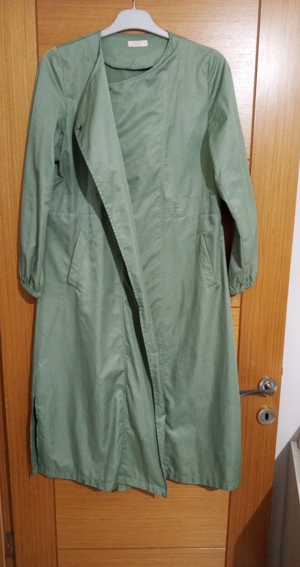 Uzun, bej renkli, sentetik kumaştan yapılmış, yakası kesimli ve bol kesim kadın yağmurluğu. Dökümlü tasarıma ve uzun kollara sahip, günlük kullanım için uygun. ️