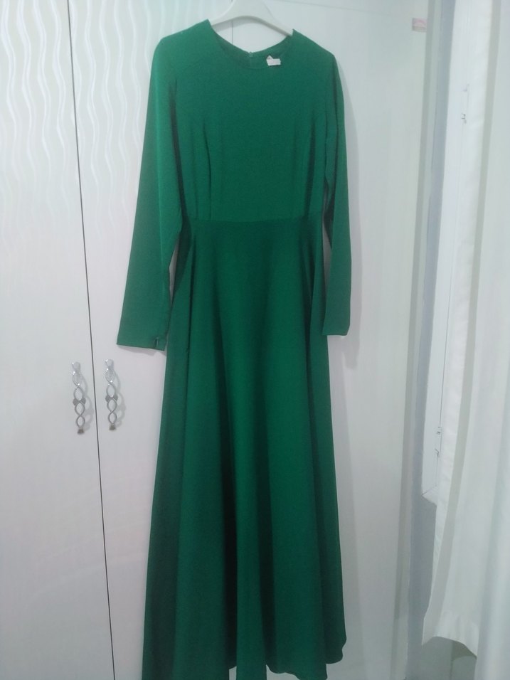 Uzun kollu, yuvarlak yakalı, koyu yeşil drapeli uzun elbise. Düz kesim, sentetik dokulu kumaştan, sade ve ofis kullanımı için uygun.Kemeri mevcut.Kemerinden dolayı bazı yerlerinde ip çekilmeleri mevcut halledilebilinir..
