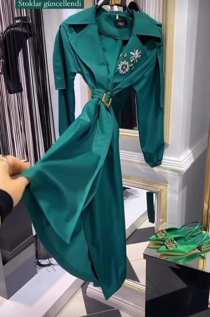 Uzun yeşil trençkot kesik yaka ve uzun kollu tasarıma sahiptir. Kuşaklı bel detayıyla klasik şıklık sunar. Parlak sentetik kumaştan yapılmış, nakışlı detaylarıyla göz alıcıdır. Günlük kullanıma uygundur.