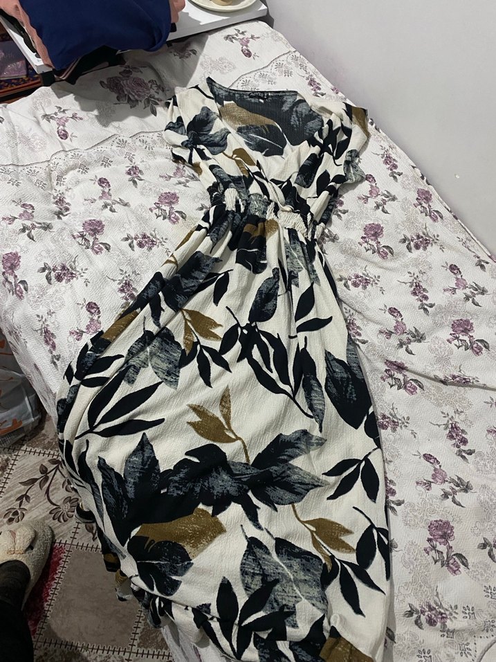 V yaka, kolsuz, bohem tarzda, uzun ve bol kesim elbise. Koyu haki çiçek desenlidir, günlük kullanım için uygundur.