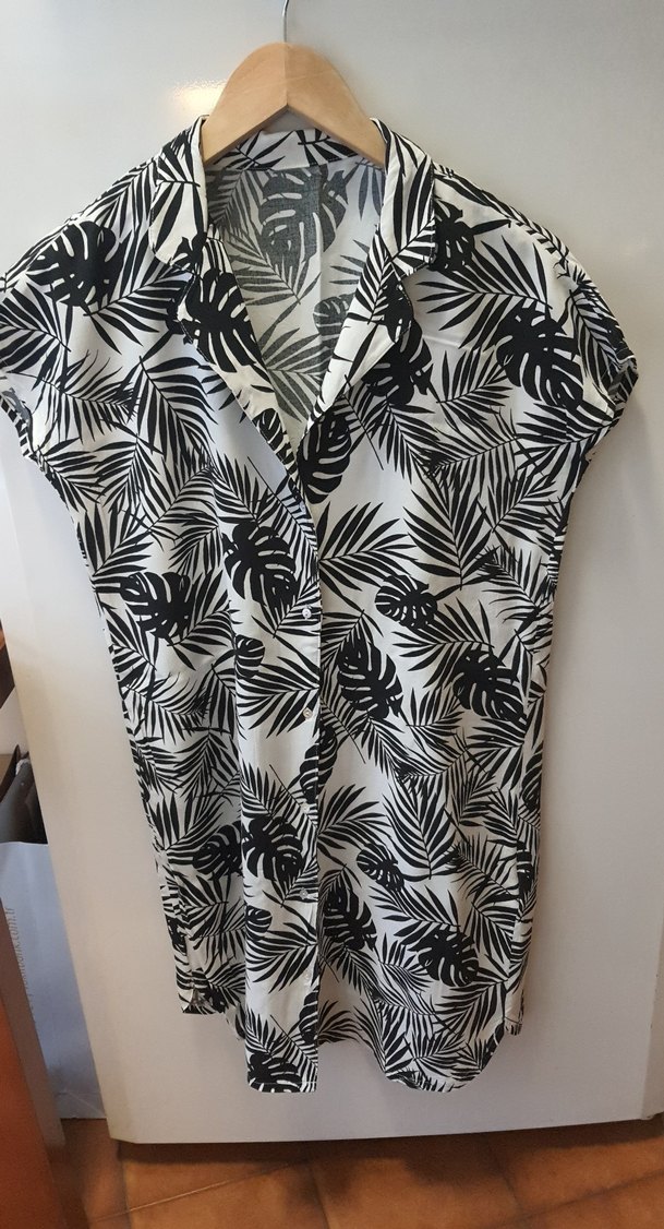 Kadınlar için kısa kollu, V yaka ve düğmeli uzun tunik. Siyah beyaz yaprak desenli, sentetik dokulu, salaş kesim ve uzun boy. Rahat sokak stili için uygun.
