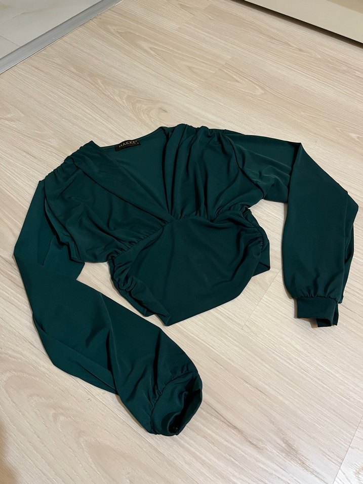 Kadınlar için v yaka ve drapeli detaylara sahip, sentetik kumaştan yapılmış, uzun kollu ve vücuda oturan koyu yeşil bluz. Günlük sokak stiline uygundur.