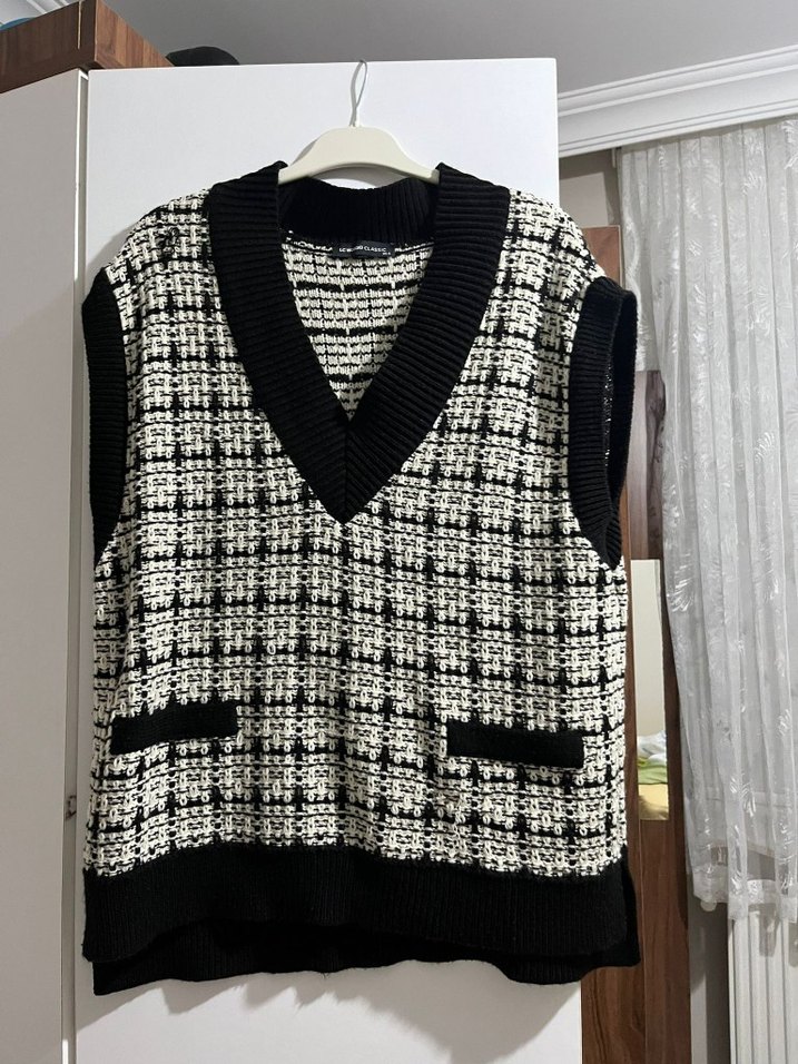 Kadınlar için V yaka, ekose desenli, triko kumaştan örülmüş, bol kesim ve cepli süveter. Günlük rahat sokak stili için uygundur.