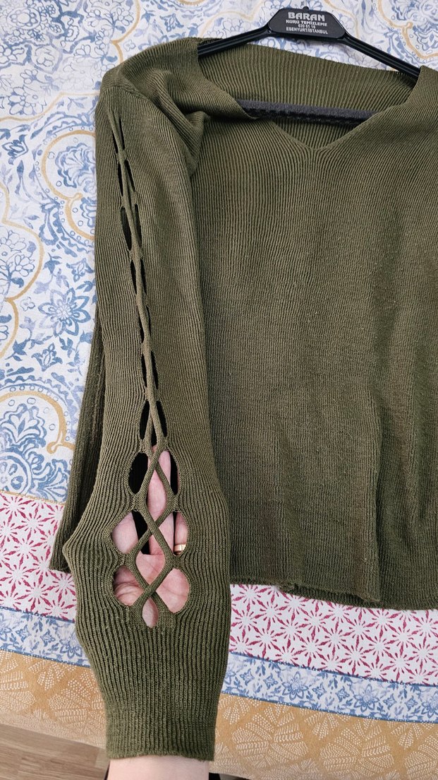 V yaka, uzun kollu, fitilli dokuma kumaştan yapılmış kadın triko kazak. Rahat ve bohem tarzıyla günlük kullanıma uygundur.
