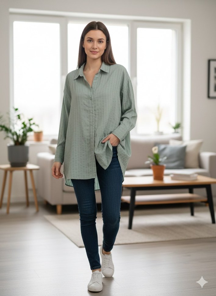 Bu kadın haki gömlek, bol kesim, V yaka ve uzun kolludur. Düğmeli ön kısmı ve midi boy uzunluğuyla denim kumaştan yapılmıştır, günlük kullanım için uygundur.