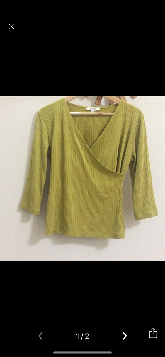 Keten kumaştan, uzun kollu ve V yakalı, pileli detaylı, pastel haki renkte, dar kesim kadın bluz.