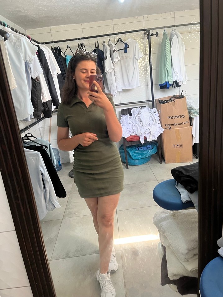 Haki renkli, v yakalı ve kısa kollu bu dar kesim mini elbise, rahat sentetik kumaştan üretilmiştir. Günlük kullanım için sokak modasına uygun, zahmetsiz şıklık sunar.