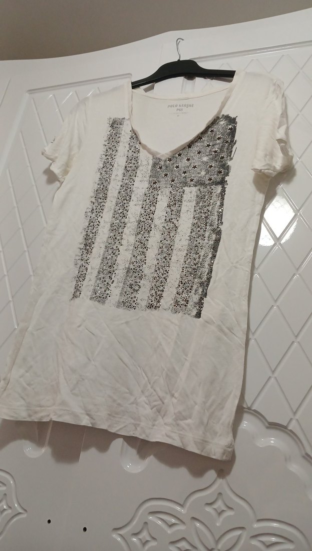 Pamuklu, V yaka, kısa kollu, bol kesim beyaz tişört, gri payetli baskı deseniyle günlük kullanıma uygundur.