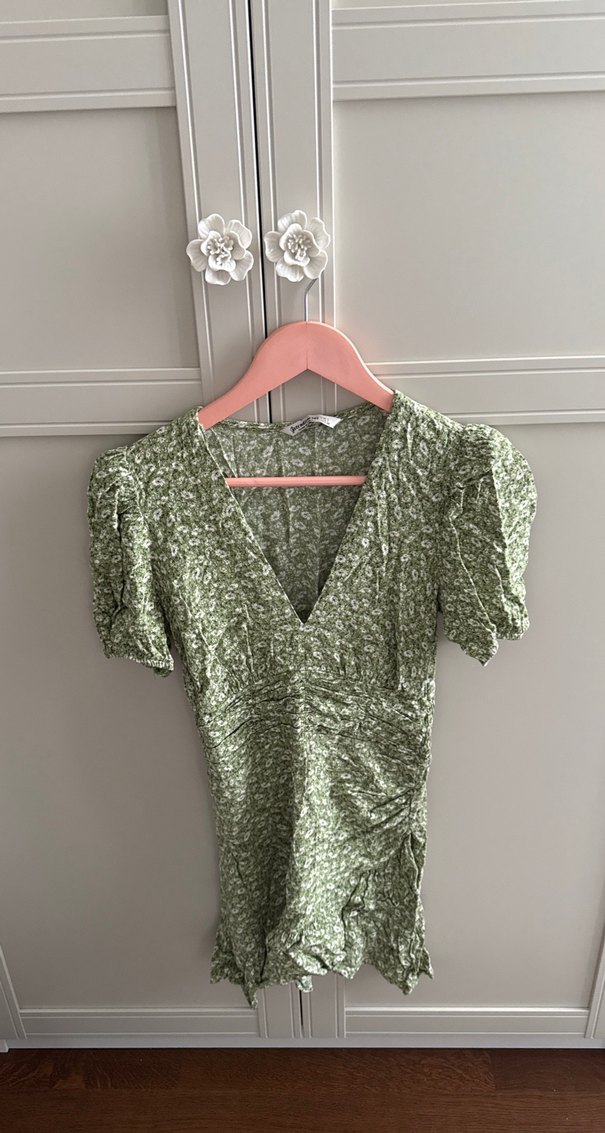 Kadınlar için V yaka, kısa kabarık kollu, hafifkumaştan yeşil ve drapeli bluz. Bohem stil için uygun.