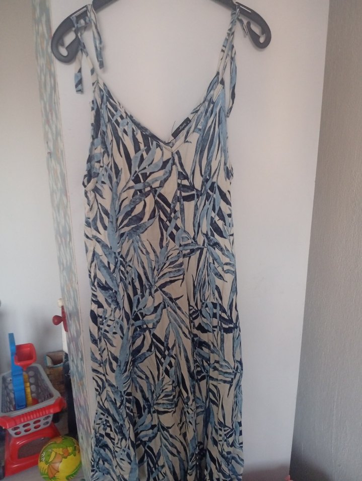 Kadınlar için kolsuz, V yakalı, bol kesim tulum. Mavi batik desenli, dökümlü tasarıma sahip yumuşak sentetik kumaftan yapılmıştır. Bohem tarzı için uygundur.