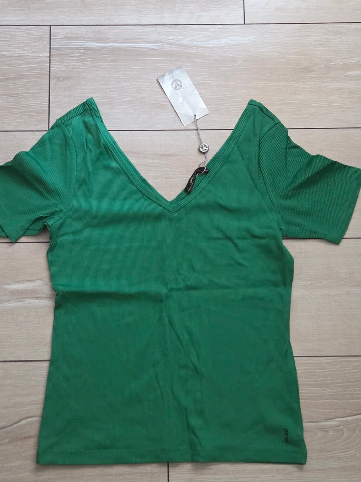 Koyu yeşil, V yaka, kısa kollu, düz ve basic tasarımlı dar kesim tişört. Rahat ve şık sokak stili için uygun.