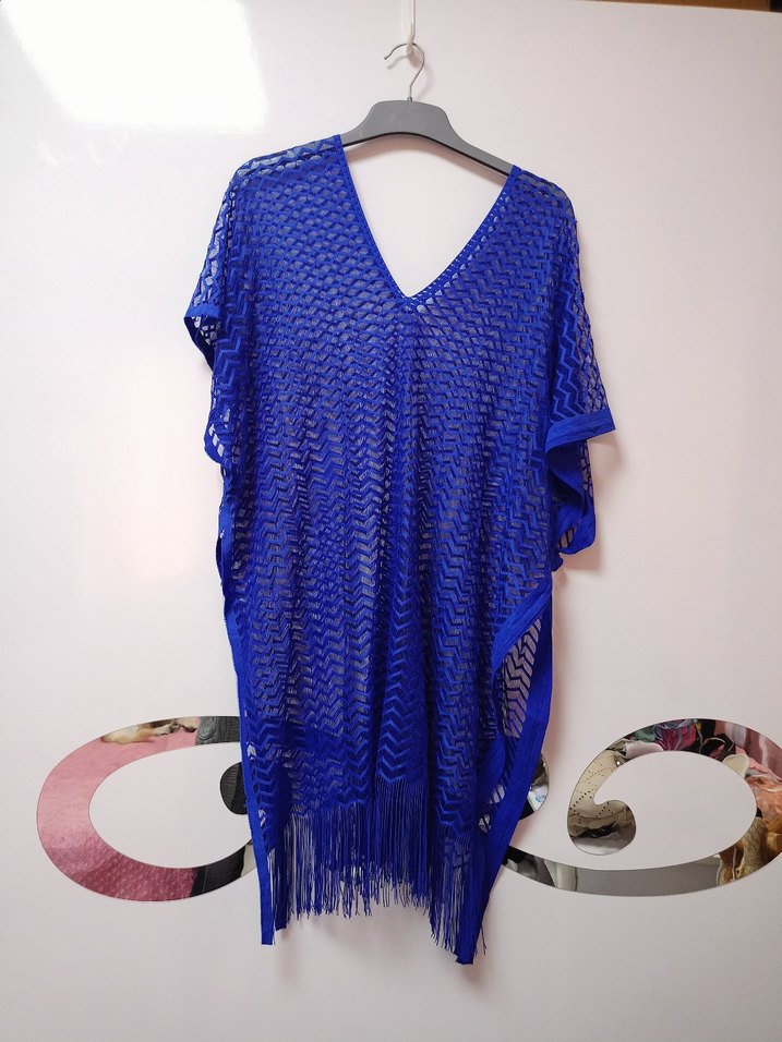 Kadınlar için V yakalı, uzun ve salaş kesim mavi renkli örgü panço. Bohem tarzda, kolsuz ve püsküllü detaylara sahip.