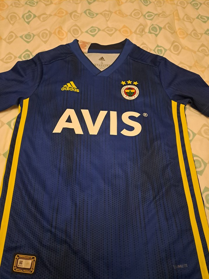 kadinlar için V yaka, kısa kollu, mavi spor forması. Sentetik kumaş, baskılı, yapışkanlı detaylı, 'AVIS' yazılı. Spor ve sokak giyimine uygun. ⚽
