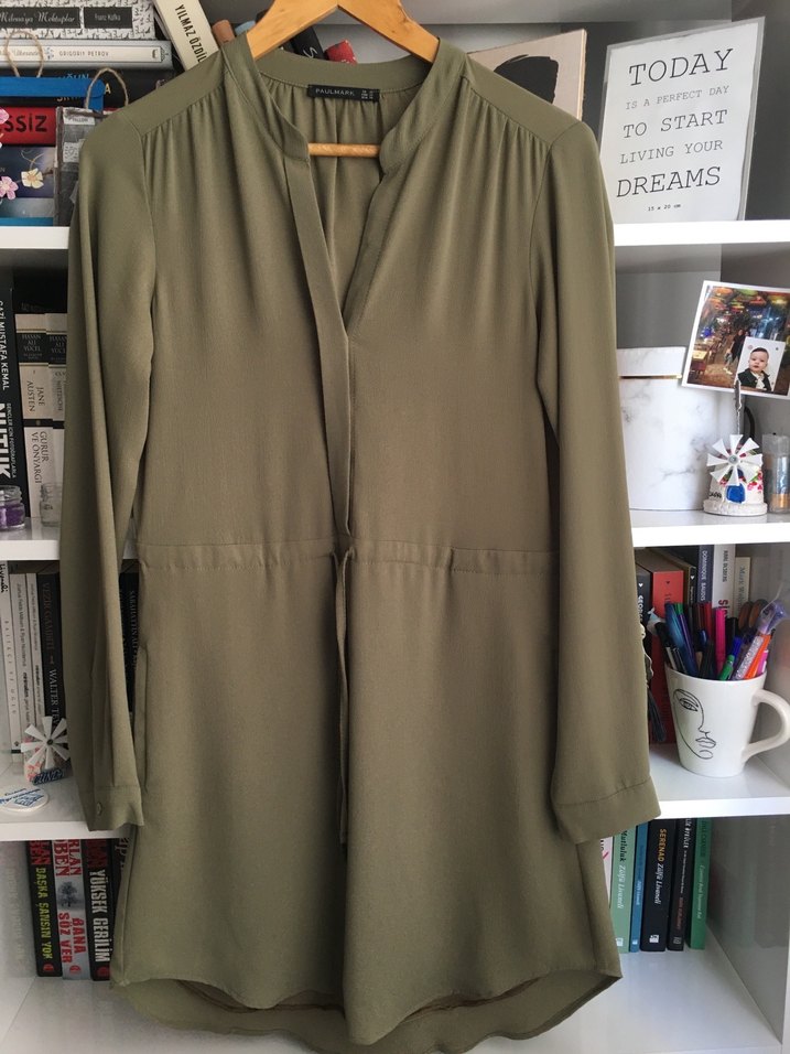 Kadınlar için kemerli, V yakalı, uzun kollu ve bol kesim midi tunik. Yumuşak ve parlak kumaştan, ofis için uygun, haki renkte. ✨