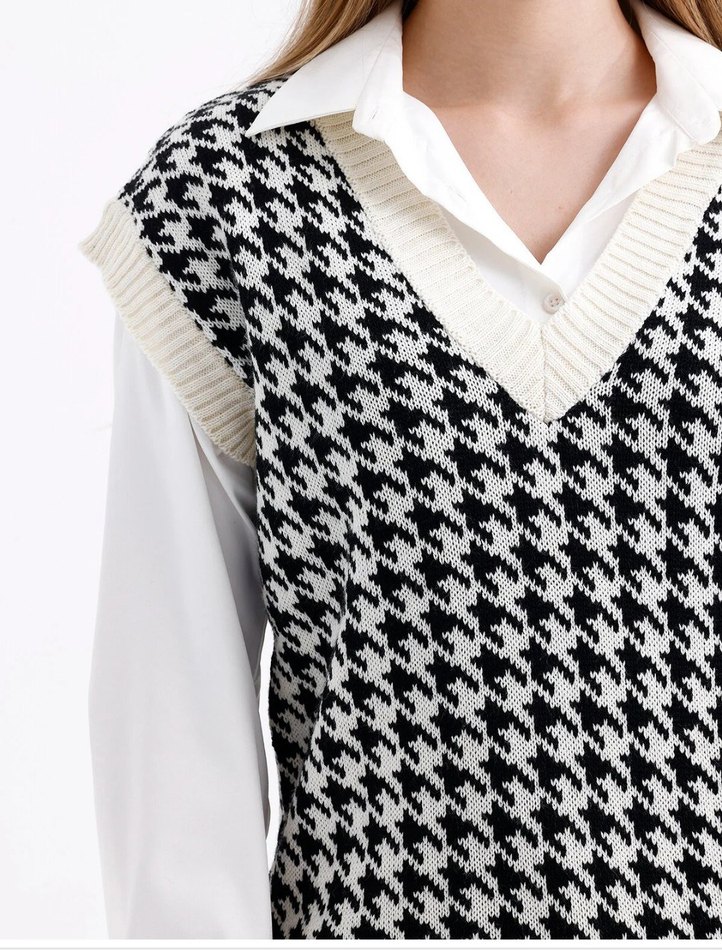 RENKLER İÇİN İLETİŞİME GEÇEBİLİRSİNİZ. Kadınlar için V yaka, örgü, sentetik kumaştan yapılmış, bol kesim ve kolsuz süveter. Siyah beyaz kazayağı desenlidir, rahat sokak tarzına uygundur.