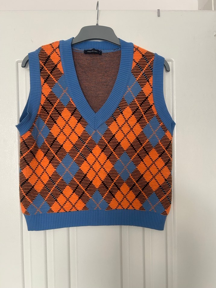 Kadınlar için V yakalı, örgü desenli ve salaş kesime sahip kolsuz süveter. Canlı çok renkli argyle deseniyle günlük sokak stiline uygundur. Sıfır gibi sayılı giyildi