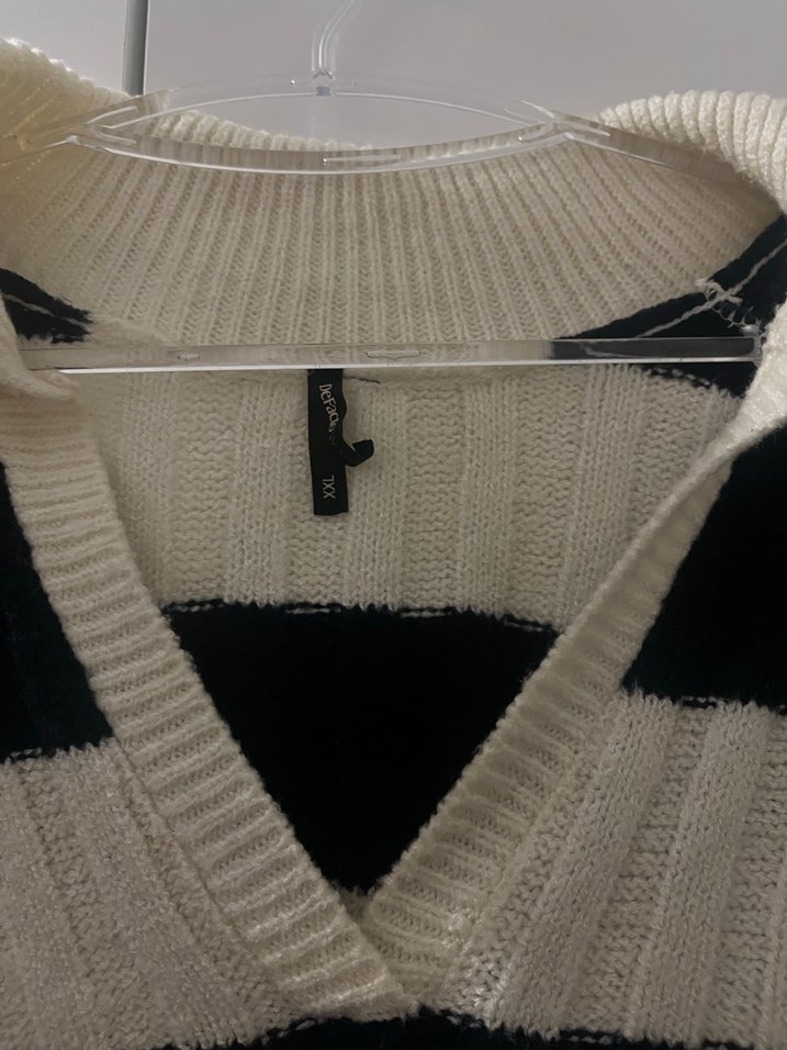 Beyaz ve gri renklerde, örgü yün kumaştan yapılmış, V yakalı ve askılı kollu, vücuda oturan kadın kazak. Günlük kullanıma uygun, rahat ve modern sokak tarzı.