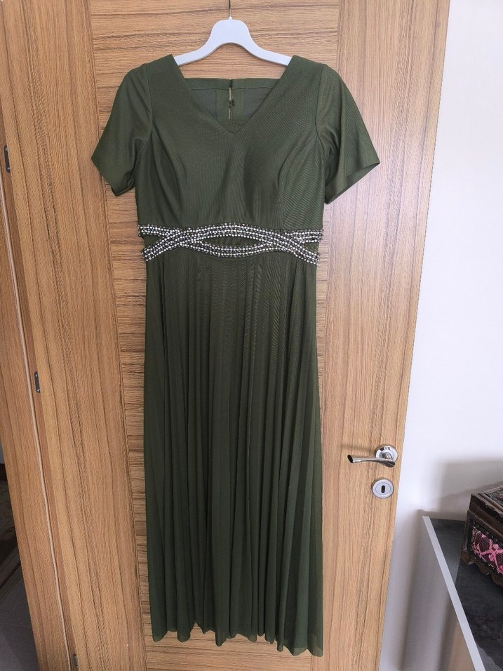 V yaka, pileli ve kısa kollu uzun abiye elbise, modern klasik ve vintage tarzı bir araya getirir. Bel kısmında taşlı dekoratif detay bulunur. Bir kez giyildi 44 beden tertemiz uygun fiyatlı.