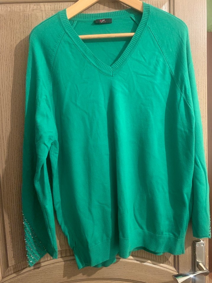 Kadınlar için parlak yeşil renkte, V yaka ve uzun kollu triko kazak. Rahat kesim ve normal uzunlukta, yumuşak örgü kumaştan, günlük sokak modasına uygun. ✨