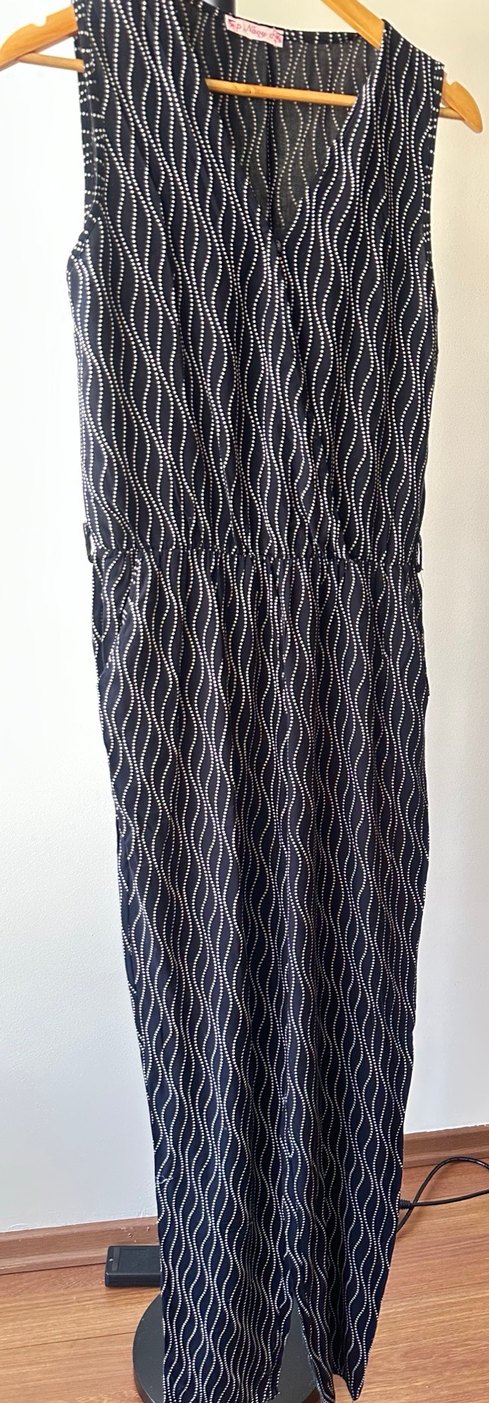 Kadınlar için V yakalı ve ince askılı, pilili yılan desenli uzun tulum. Bol kesim ve çağdaş tarzda, günlük kullanım için uygundur. Çok yeni herhangi renk solması yoktur. Memnun kalırsınız.Beden etiketi üzerinde yok. Ama M beden giyildi.