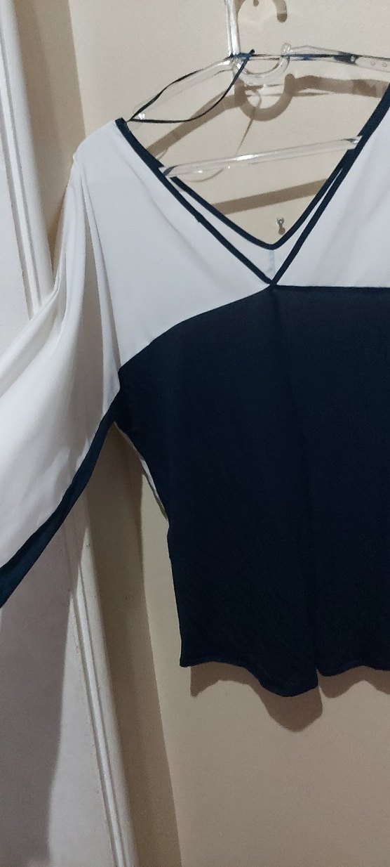 V yakalı, kollu, drapeli kadın bluz. Sentetik kumaştan, fitted kesim lacivert beyaz renk kontrastı ile günlük kullanıma uygun.