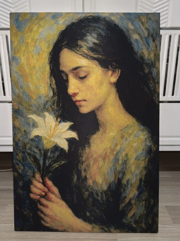 Koyu ve canlı tonlarda, beyaz zambak tutan karanlık saçlı bir kadını tasvir eden tablo. Huzurlu ve düşünceli bir atmosfer yaratıyor. Kanvas tablo dijital baskı 50x70 cm güncel stokta var #tablo