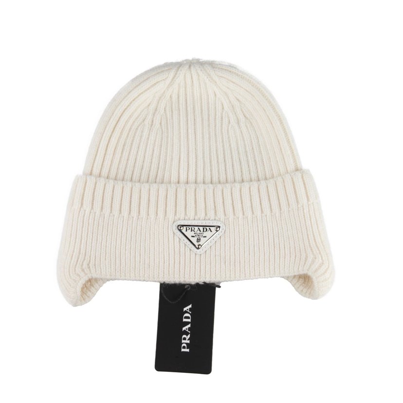 Beyaz örgü yünden yapılmış bu Prada bere, rahat ve trend sokak tarzı sunar. Katlanabilir yapısı ve Prada logosu vardır. ❄️