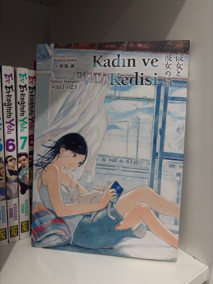 "Kadın ve Kedisi" adlı manga, pencereden gün ışığı alan bir kadının kitap okuduğu sakin bir sahneyi gösteriyor. Detaylı ve huzurlu bir kapak resmi.