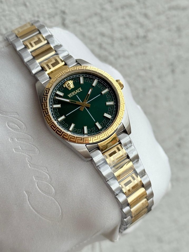 Kadın saatte parlak yeşil kadran ve kemerli, gümüş ve altın tonlarında metal kordon bulunur. Modern ve klasik tasarımı bir araya getirir. ⌚