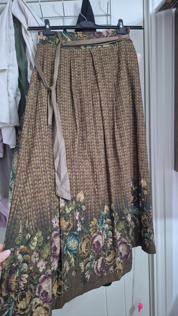 Kahverengi pileli uzun etek, desenli dokusu ve etek ucundaki çiçek detaylarıyla dikkat çekiyor. Bol kesim, bohem stil için uygun ve ofis kullanımına uygun.