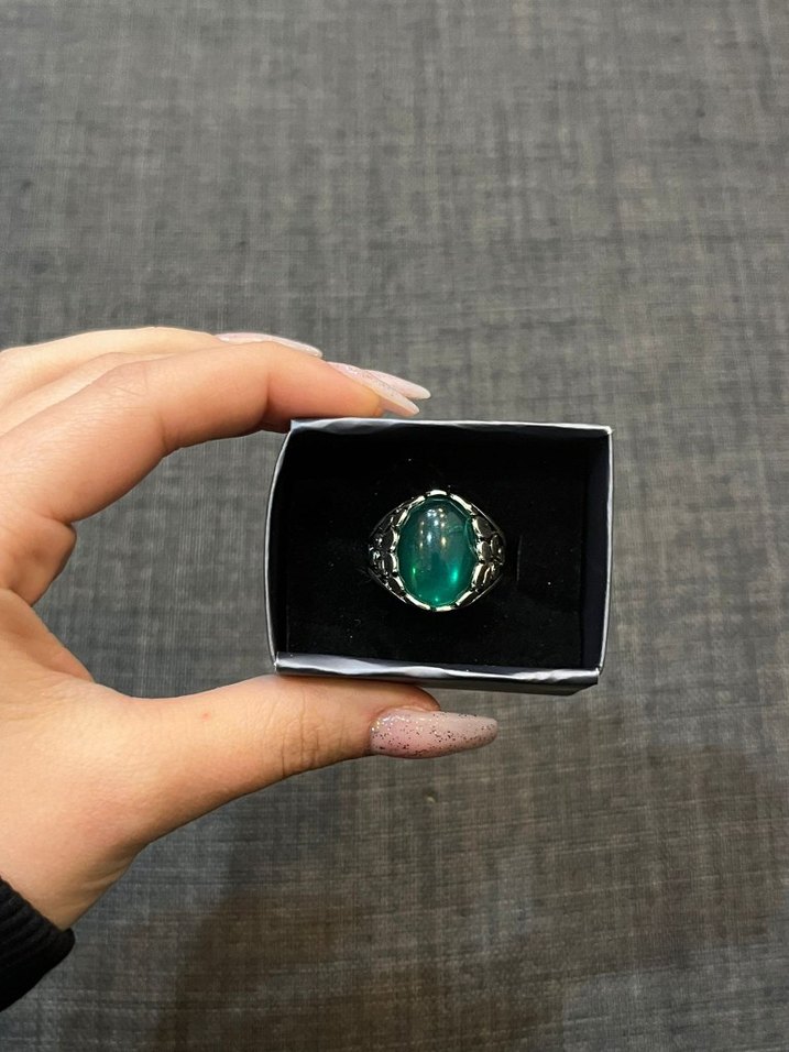 Kadin yüzük, koyu turkuaz taş ve vintage bohem tarzıyla dikkat çekiyor. GÜMÜŞ