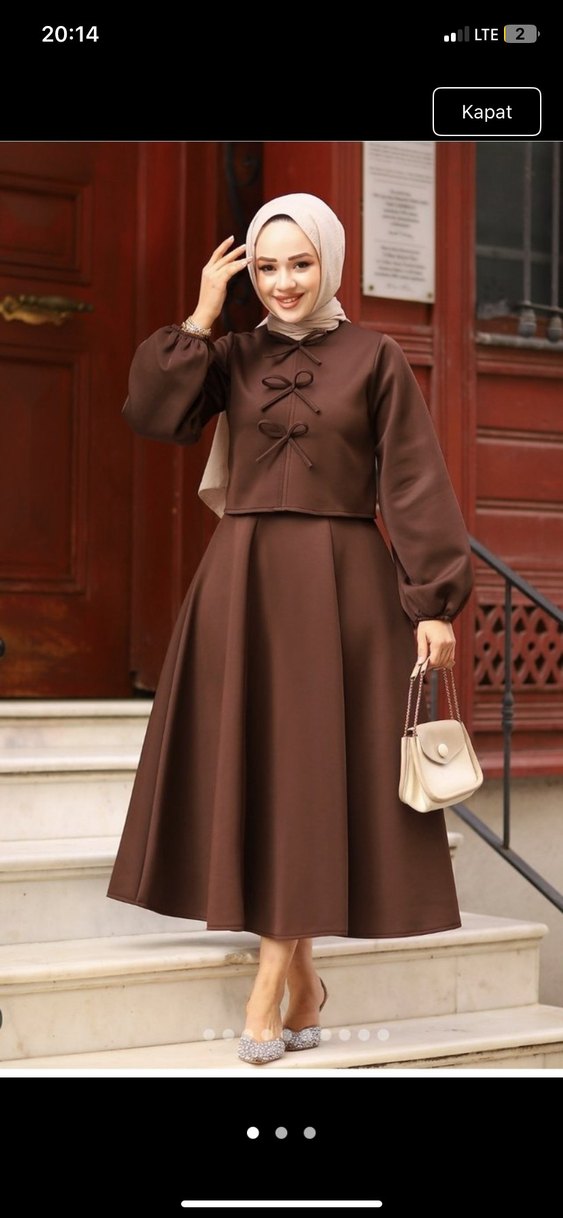 Kadınlar için uzun, bol kesim ve uzun kollu vintage bohem tarzda, parlak kahverengi renkte ve önünde dekoratif fiyonk detayları bulunan elbise.
