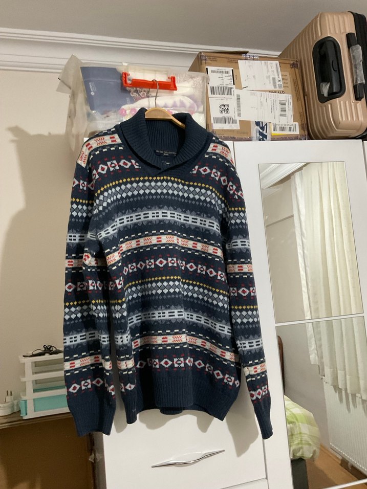 çok renkli desenli, yüksek yakalı ve uzun kollu örgü salaş kazak. Günlük kullanıma uygundur. Boy:78 cm Bel:80cm Kol:71 cm