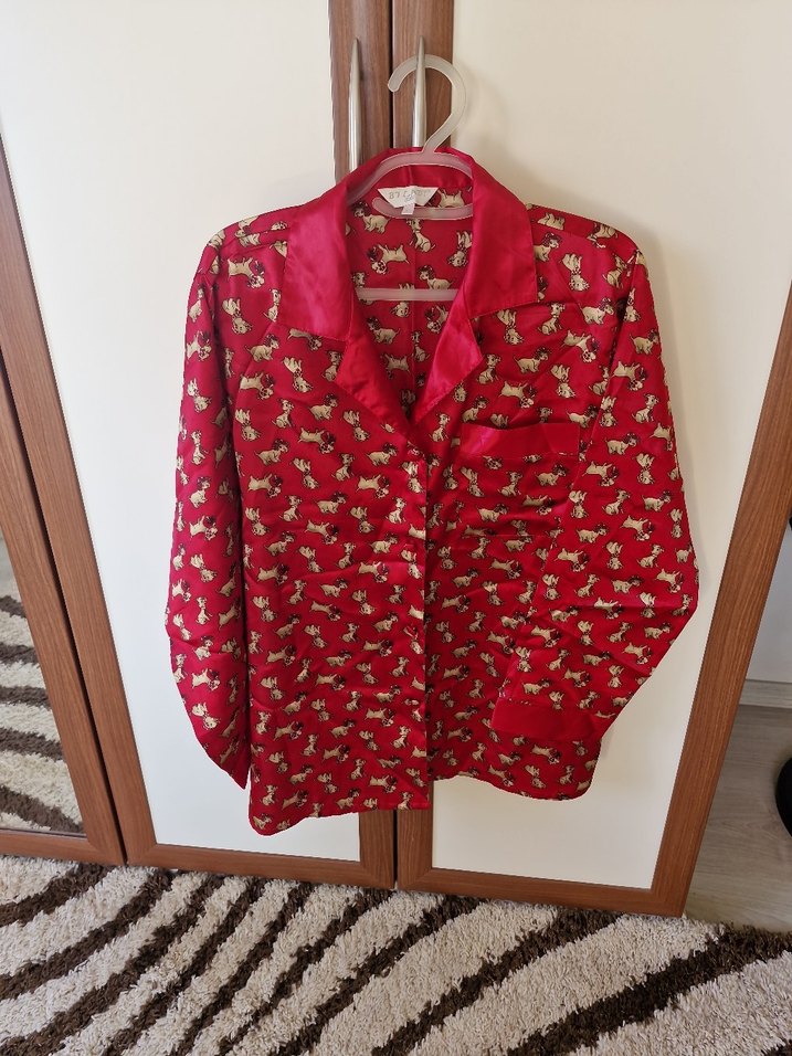 Kadınlar için uzun kollu, bol kesim, parlak ipek saten kırmızı kumaştan vintage desenli pijama üstü ve altı yeni. Klasik yakalı ve midi boyda, rahat sokak stili için uygundur.