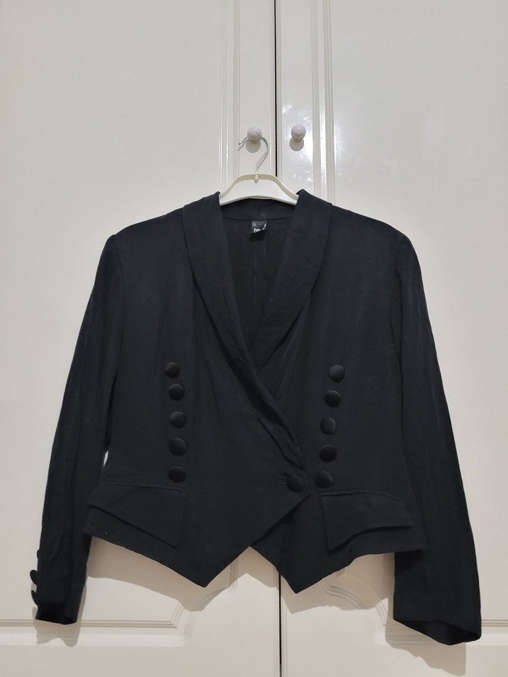 Siyah midi uzunlukta, düğmeli, yakası kesimli kadın blazer ceket. İpeksi kumaştan, uzun kollu ve normal kesim. Ofis için uygun, gotik tarzda. Vintage bir üründür. Herhangi bir problemi yoktur. S-M bedene uygundur. Duruşu çok şık, arkasında dantelli bağlama detayı vardır.