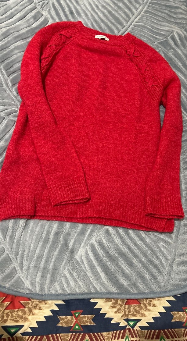 Kadınlar için yumuşak yün ve örgü dokusuyla, uzun kollu ve yuvarlak yakalı, kırmızı bol kesim kazak. Rahat ve sıcak tutar, günlük kullanım için uygundur.
