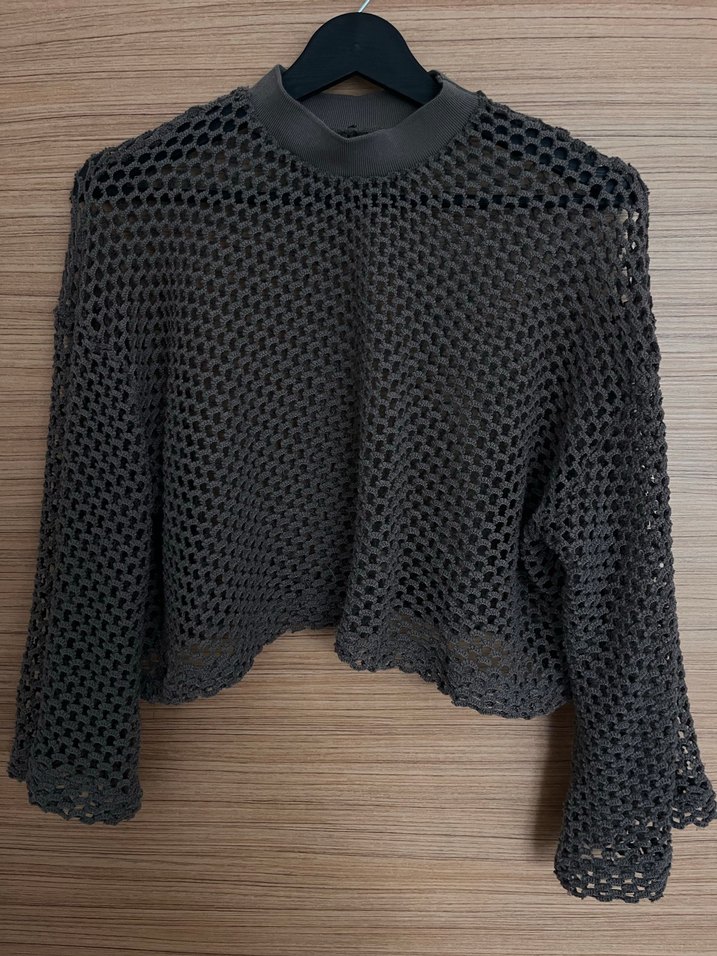 Vizon renkli, uzun kollu, bol kesim kısa file örgü kazak. Yuvarlak yaka ve açık örgü deseni ile rahat sokak stiline uygun.