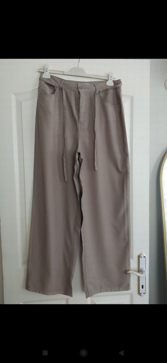 Kadın vizon renk Keten Kemerli Bol Paça Pantolon