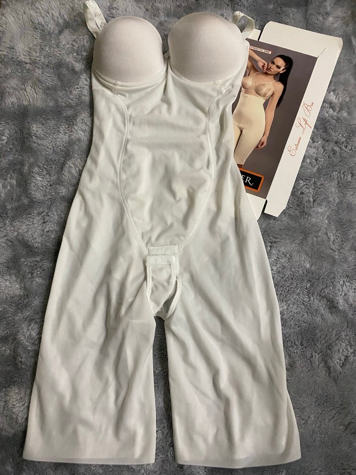 Beyaz renkte, Gögüs destekli, bacaklı tam vücut toparlayıcı korse. Bel, karın, kalça ve basen bölgesini etkili şekilde toparlar, sıfır ürün. 85B beden.
