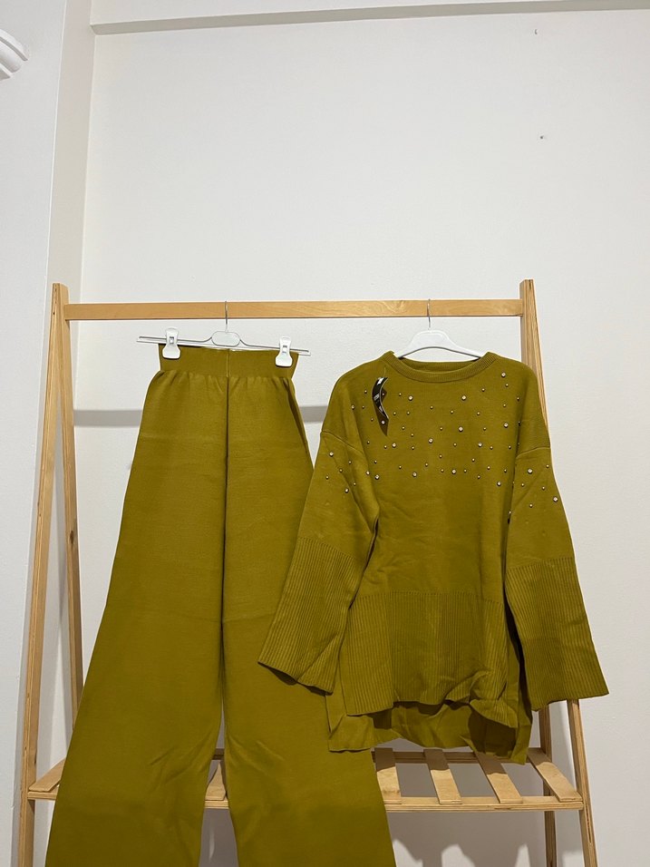 Sıfır ürün standart bedendir Kadın yap yeşil renginde, triko örme kumaştan, uzun kollu ve yuvarlak yakalı, bol kesim uzun takım. Günlük kullanıma uygun, parlak ve minimalist tarzda. ✨