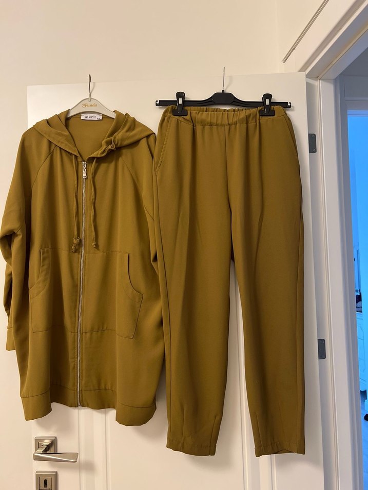Kadınlar için rahat kesim, midi boy, uzun kollu yağ yeşili eşofman takımı. Yumuşak ve sıcak kumaştan üretilmiş, günlük kullanıma uygun. S-M bedendir.