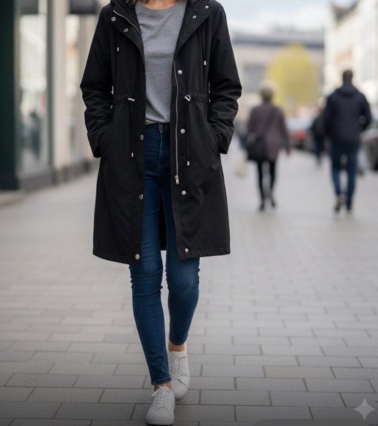 Kadın yagmurluk kemerli ve normal uzunlukta midi parka. Notched lapel yakalı, uzun kollu ve bol kesimdir. Günlük sokak stiline uygundur.