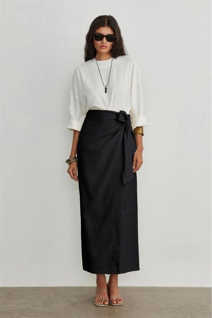 Kadın yandan bağlamalı içi astarlı fiyonklu uzun keten etek