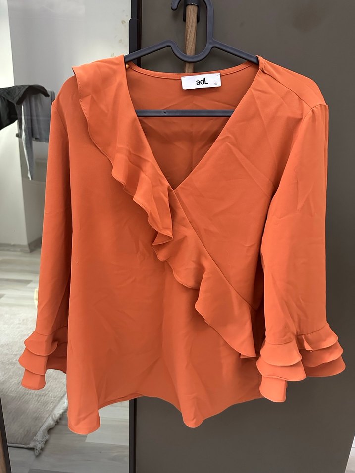 Kadın yanık turuncu renk V Yakalı Fırfırlı Bluz