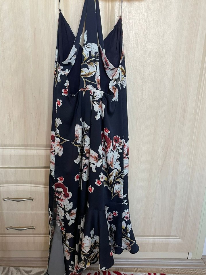 Yazlık kumaş, lacivert, çiçek desenli kadın elbise. Sırt kısmında detaylar, ön kısmı v yaka. Yırtmaç kısmı istenildiği gibi kapatılabilir, düğmeli. Etek uçları fırfırlı. İçinde astarı mevcut. Zara marka. S beden.