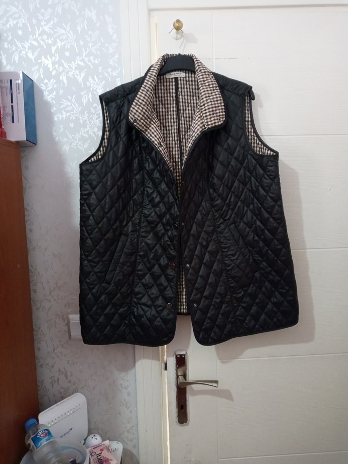 Düğmeli, kolsuz siyah yelek, dışı kapitone, içi kareli astarlı, normal boy ve regular kesim sokak stiline uygun. 46.48 beden uyumlu 1 kere denendi ölçüleri görselde eklidir